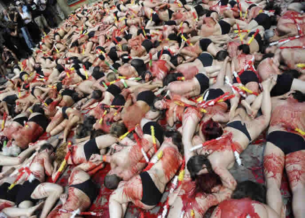 Las integrantes de organizaciones por los derechos de los animales, PETA y Anima Naturalis, se cubren con pintura roja como parte de una protesta en contra de las corridas de toros