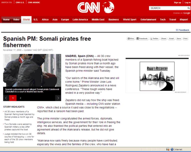 La cadena americana CNN ha ofrecido información actualizada tanto en televisión como en su página web, en donde ha colocado la noticia de la liberación del Alakrana en un lugar preferente de su portada, en segundo lugar en la izquierda de la web y con una imagen incluída. Dentro, la CNN destaca el discurso de Zapatero y la confirmación de que los tripulantes españoles ya están a salvo.