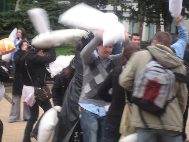 Guerra de almohadas en el centro de Madrid