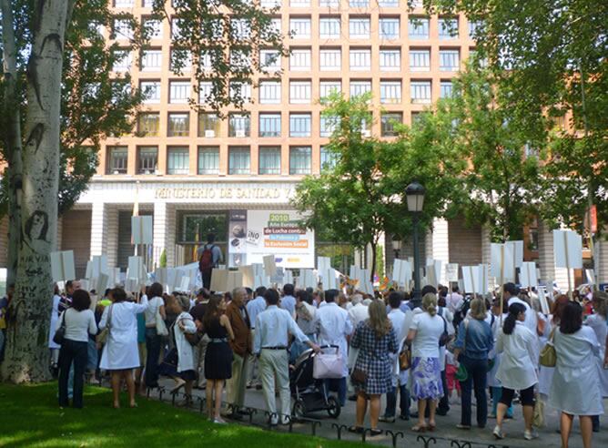 Centenares de médicos y farmacéuticos se han concentrado frente a la sede del Ministerio de Sanidad y Política Social en Madrid para protestar contra los recortes salariales y defender la "sostenibilidad, equidad y calidad del Sistema Nacional de Salud (SNS)".