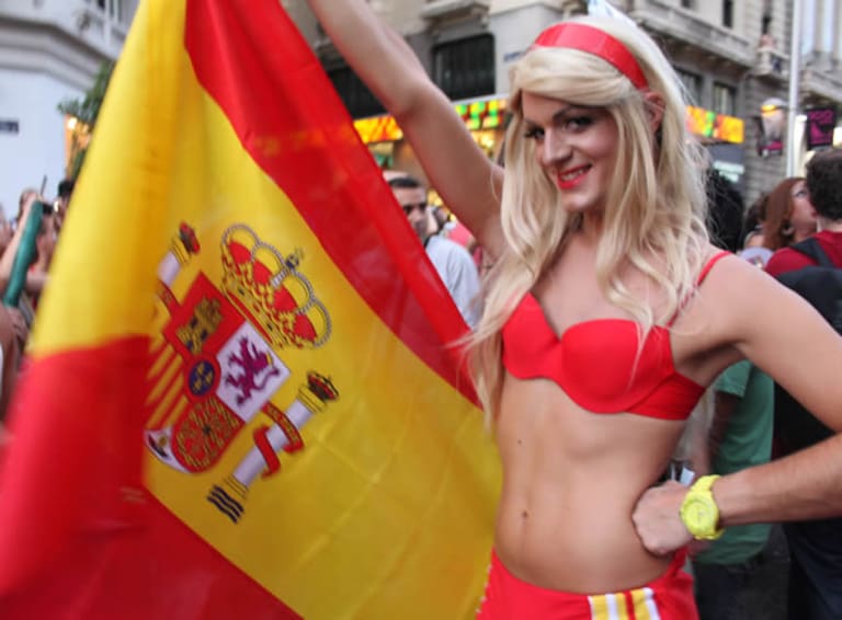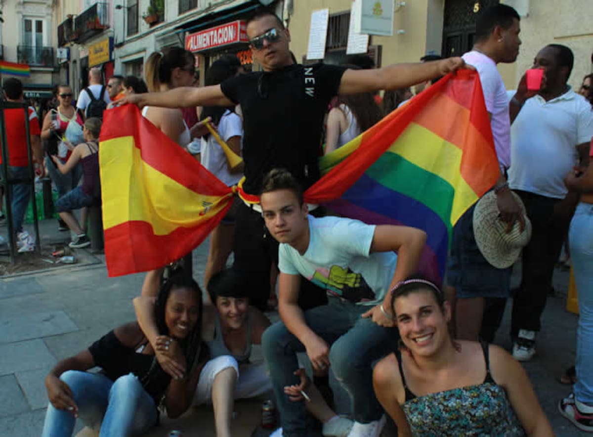 Un grupo de chicos celebra en la Plaza de Chueca las fiestas de Orgullo y el prepara el ambiente para el partido de España contra Paraguay