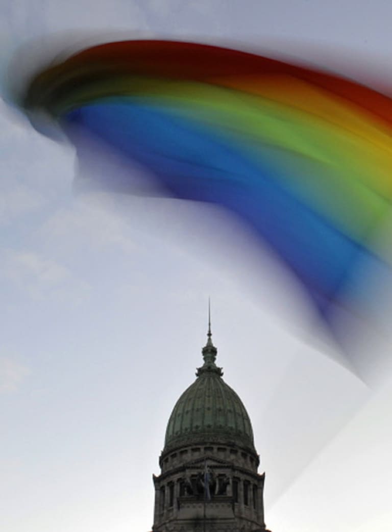 Una bandera arcoiris ondea frente al Congreso en Buenos Aires
