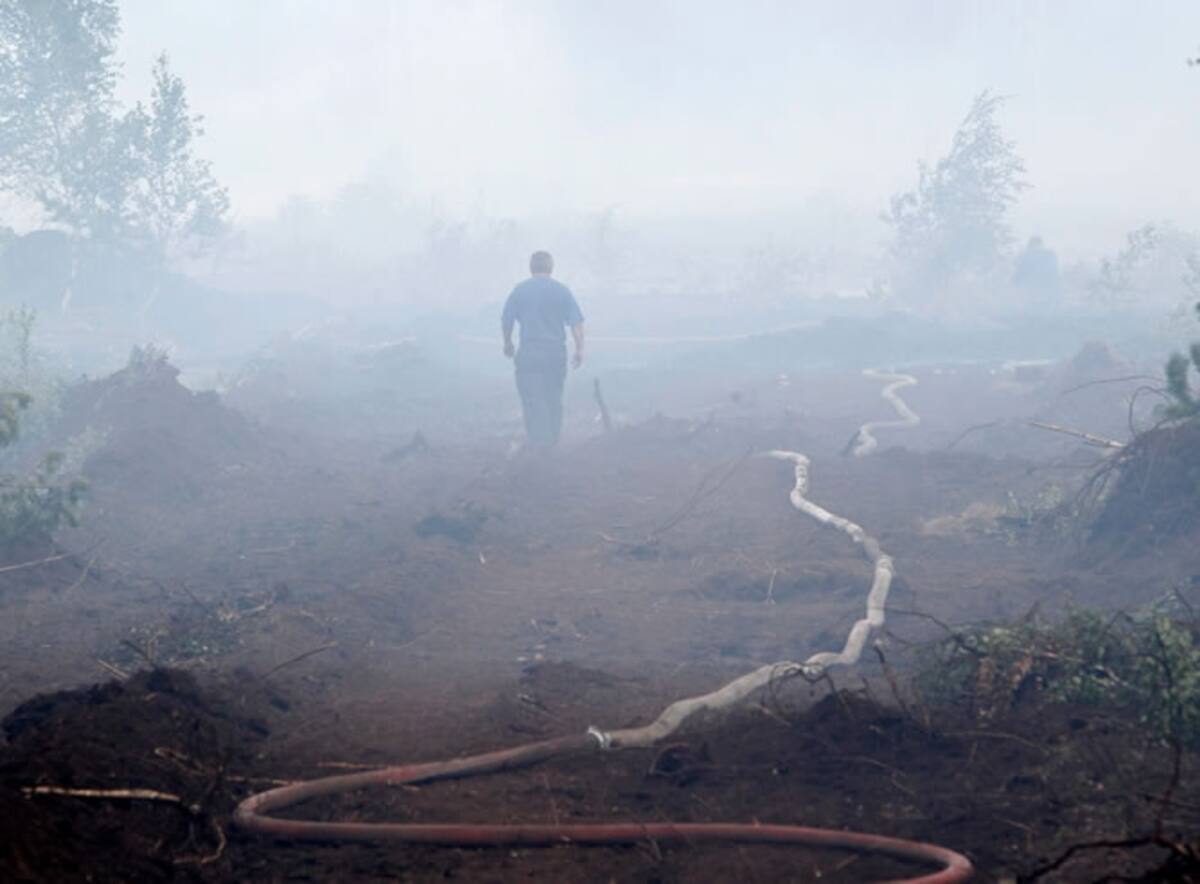 Un bombero camina entre el humo en un bosque devastado por las llamas en Shatura, Rusia