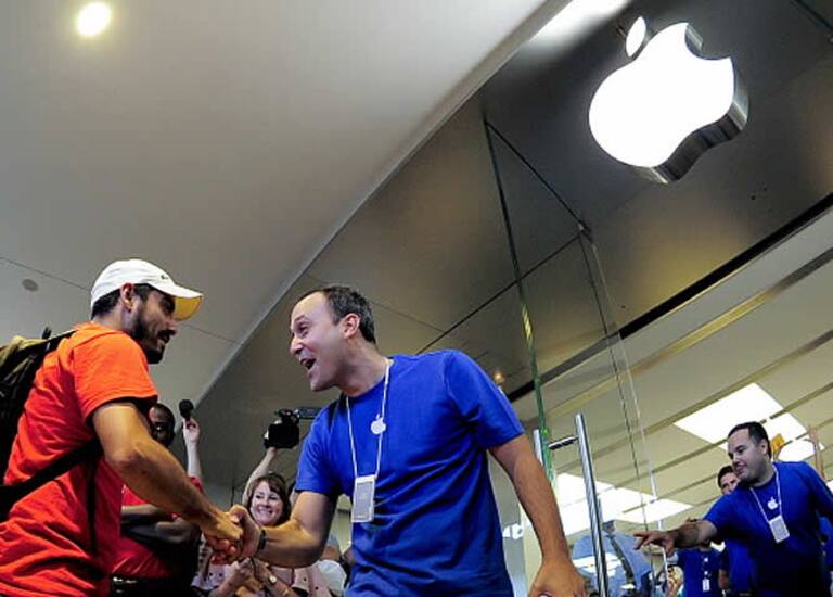 Un empleado da la bienvenida a uno de los visitantes de Apple