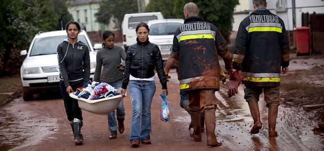 Tres mujeres jóvenes que cargan sus pertenencias encuentran a un par de bomberos a su paso por una calle cubierta de lodo rojo, en Devecser, a unos 164 kilómetros de la capital, Budapest. La ruptura de un dique en la localidad de Ajka produjo el vertido tóxico de un material conocido como "barro rojo", una sustancia química muy tóxica, corrosiva y alcalina, lo que ha resultado en la muerte de cuatro personas(EFE)