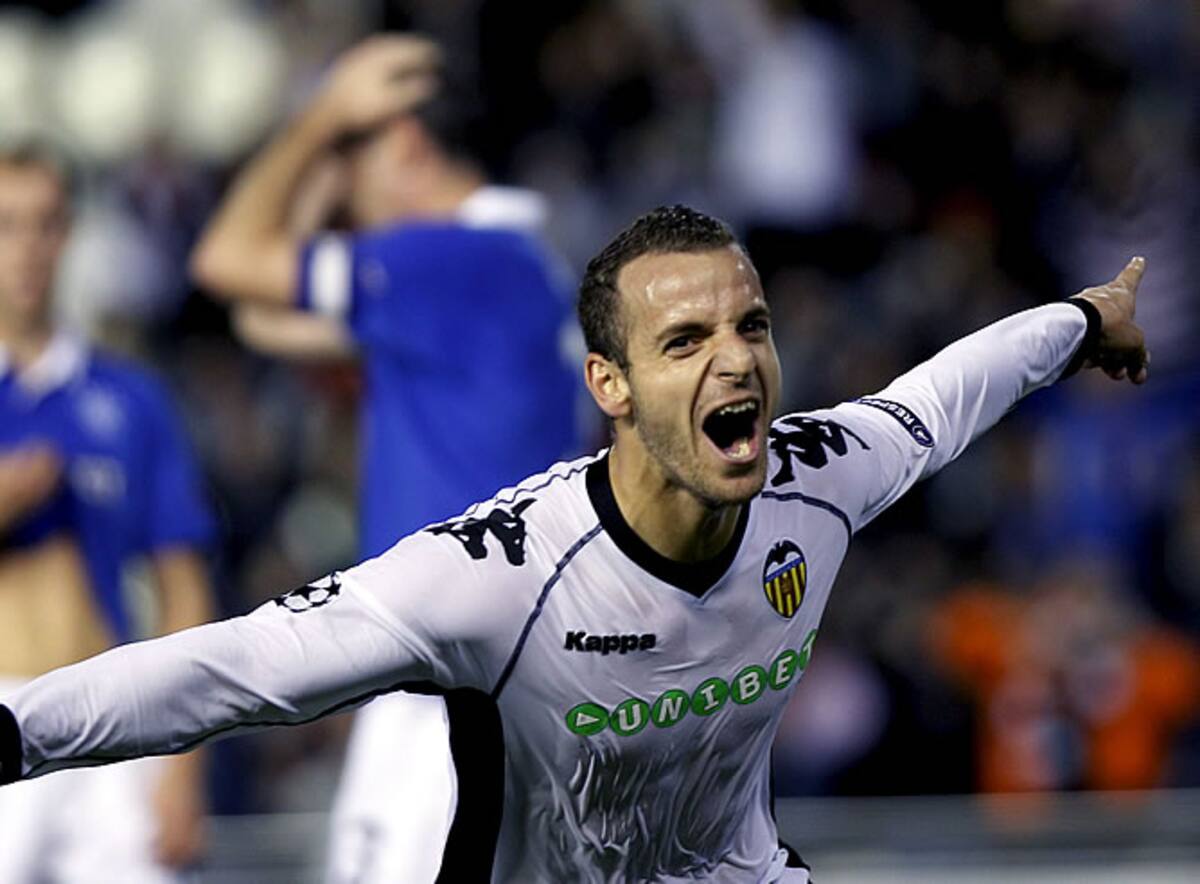 El delantero del Valencia Roberto Soldado celebra la consecución del primer gol de su equipo frente al Glasgow Rangers.