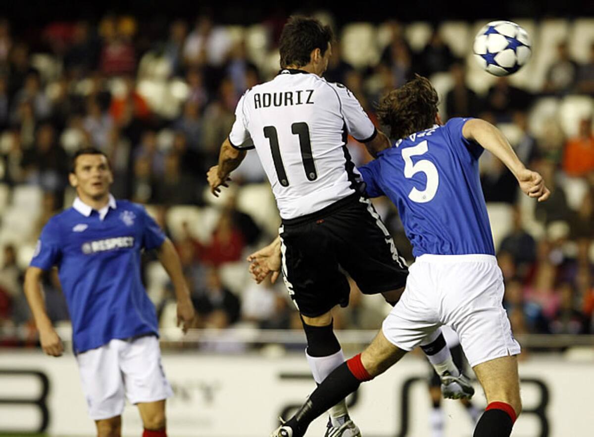El delantero del Valencia, Aduriz, intenta rematar un balón en el área del Rangers
