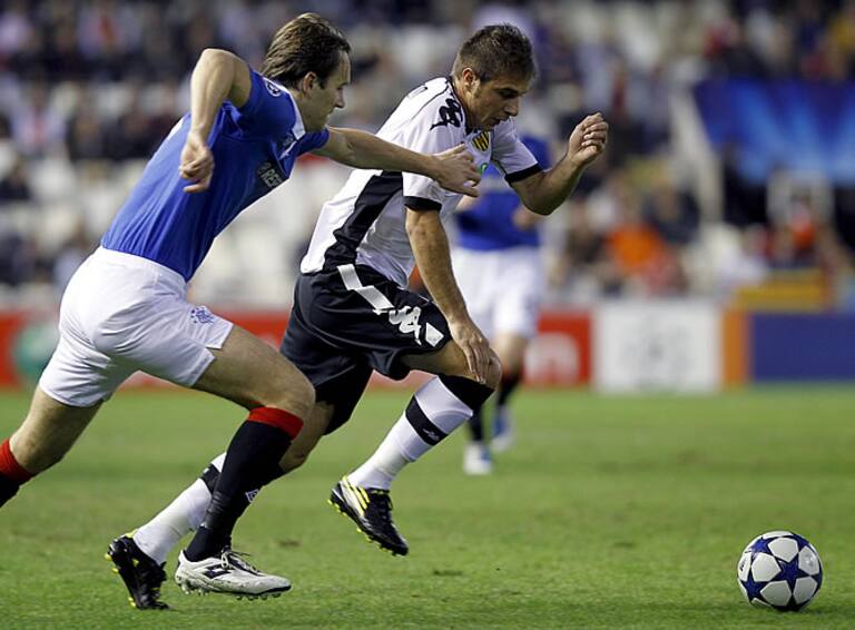 El centrocampista del Valencia Joaquín Sánchez pelea un balón con el defensa bosnio del Glasgow Rangers, Sasa Papac.