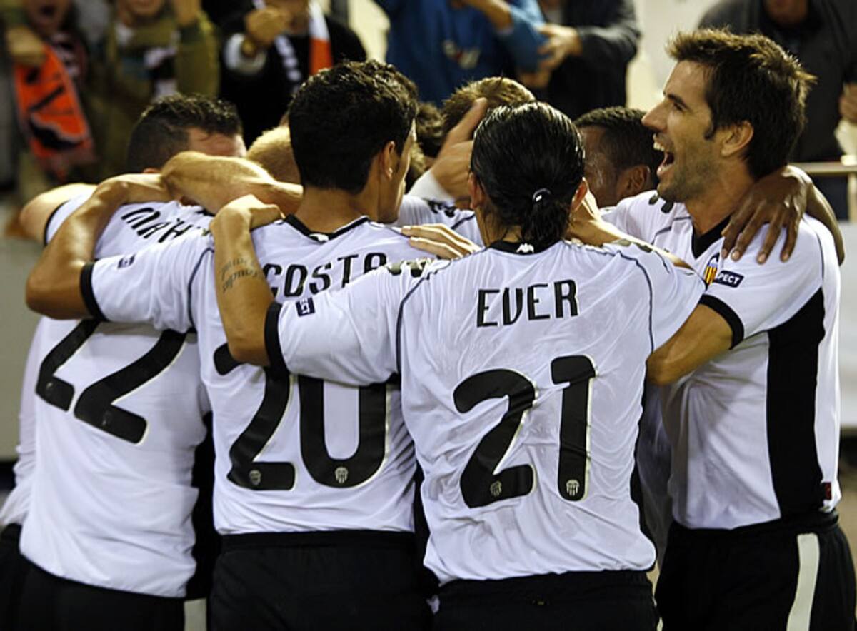Los jugadores del Valencia se abrazan para celebrar el primer gol para los ché, marcado por Soldado