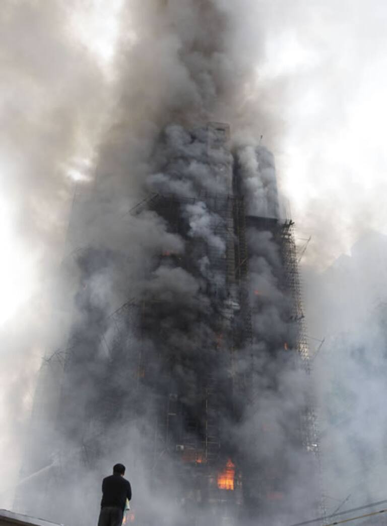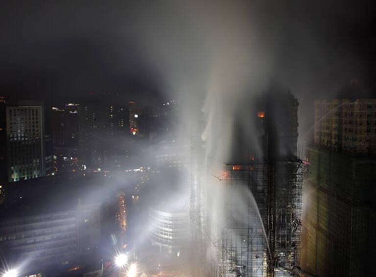 Cientos de bomberos chinos luchan para apagar un incendio en un rascacielos de 25 pisos