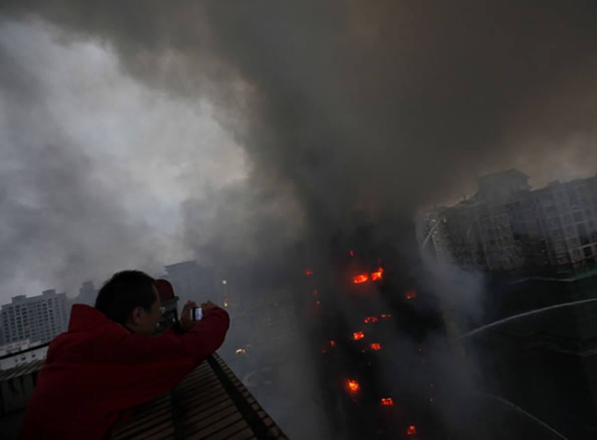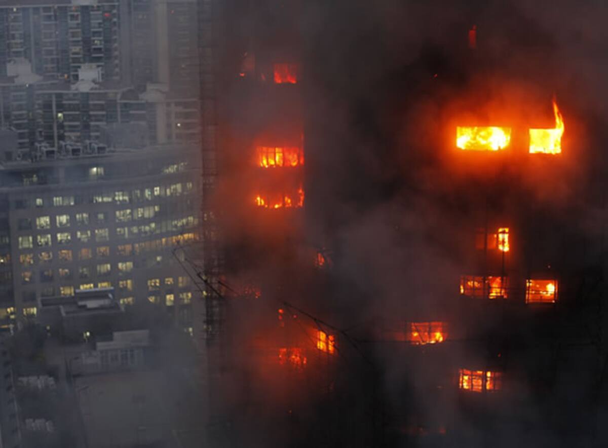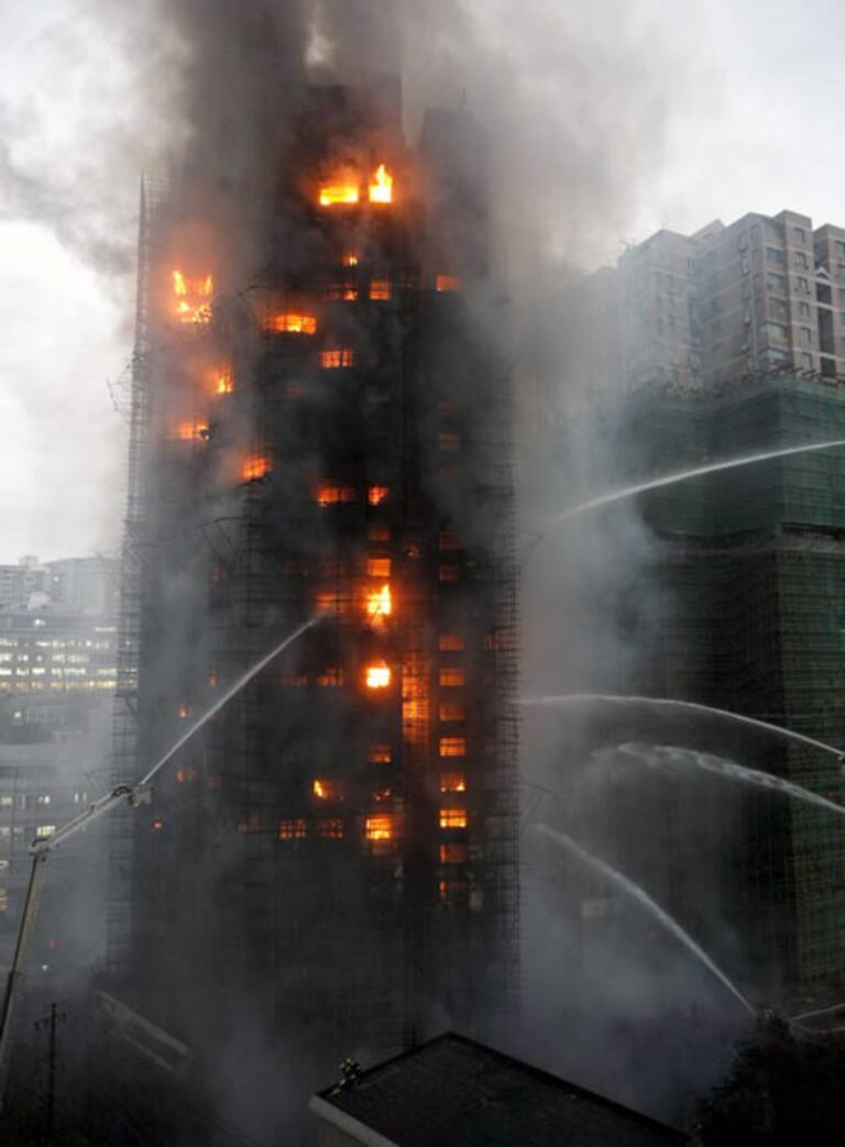 Cientos de bomberos chinos luchan para apagar un incendio en un rascacielos de 25 pisos que estaba en obras en Shangai, China, el lunes 15 de noviembre de 2010. Hasta el momento no se sabe si hubo víctimas.