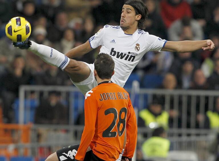 El centrocampista alemán del Real Madrid Sami Khedira (atrás) golpea el balón ante el centrocampista del Valencia Jordi Alba Ramos