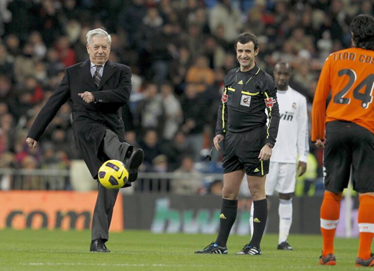 El escritor peruano Mario Vargas Llosa (i) hace el saque de honor del partido correspondiente a la decimocuarta jornada de Liga en Primera División que disputan esta noche el Real Madrid y el Valencia en el madrileño estadio Santiago Bernabéu