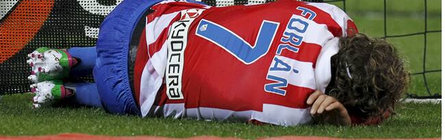 El delantero uruguayo del Atlético de Madrid, Diego Forlán, cae lesionado sobre el terreno de juego durante el partido, correspondiente a la ida de los octavos de final de la Copa del Rey, que el conjunto rojiblanco disputa contra el RCD Espanyol esta noc(EFE)