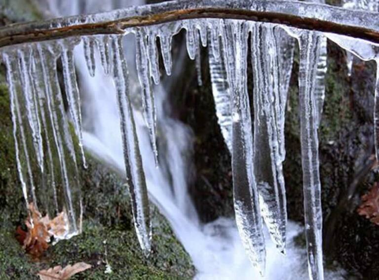 Las ramas de algunos árboles han amanecido con formaciones similares a estalactitas de hielo a consecuencia de las bajas temperaturas que se registran en la Sierra de Francia, entre los términos municipales de El Maillo y Serradilla del Arroyo, en Salaman