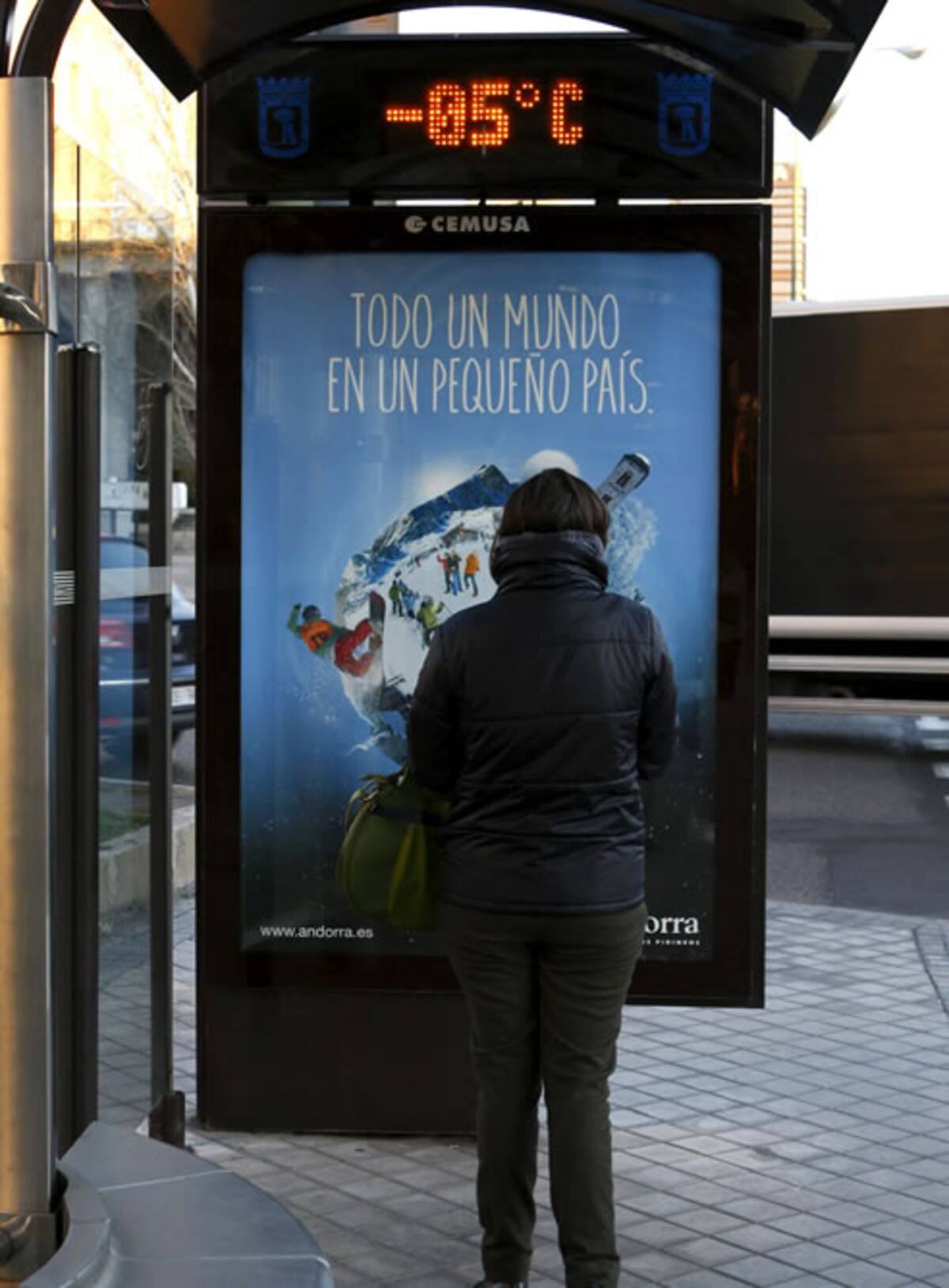 Algunos termómetros de la capital madrileña marcaron durante la mañana de hoy temperaturas bajo cero, como el que se aprecia en la fotografía, tras las fuertes heladas registradas la pasada noche