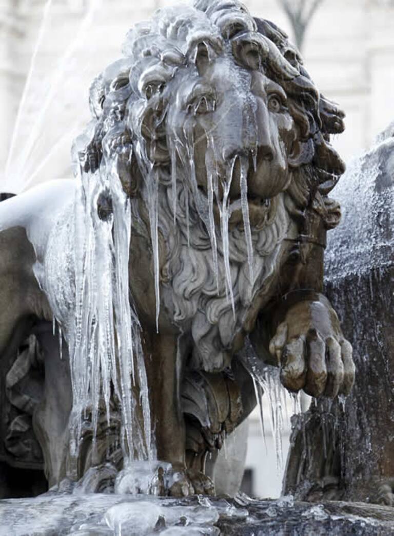 Los leones del carro de la diosa Cibeles llenos de carámbanos tras las fuertes heladas registradas en Madrid, al igual que en otros puntos de la geografía. En las cercanías de la capital, el municipio serrano de Buitrago de Lozoya ha llegado a 9,8 grados