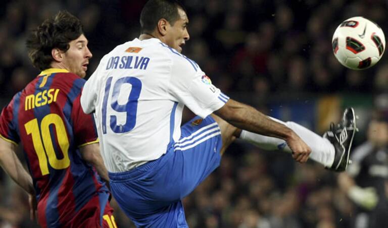 El delantero argentino del F.C. Barcelona Lionel Messi disputa un balón con el defensa brasileño del Real Zaragoza Paulo César da Silva