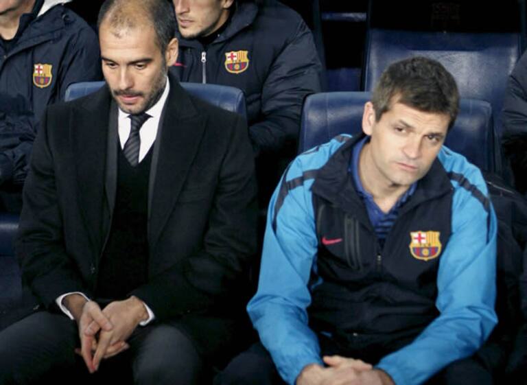 Vilanova, junto a Guardiola, en el banquillo del Camp Nou