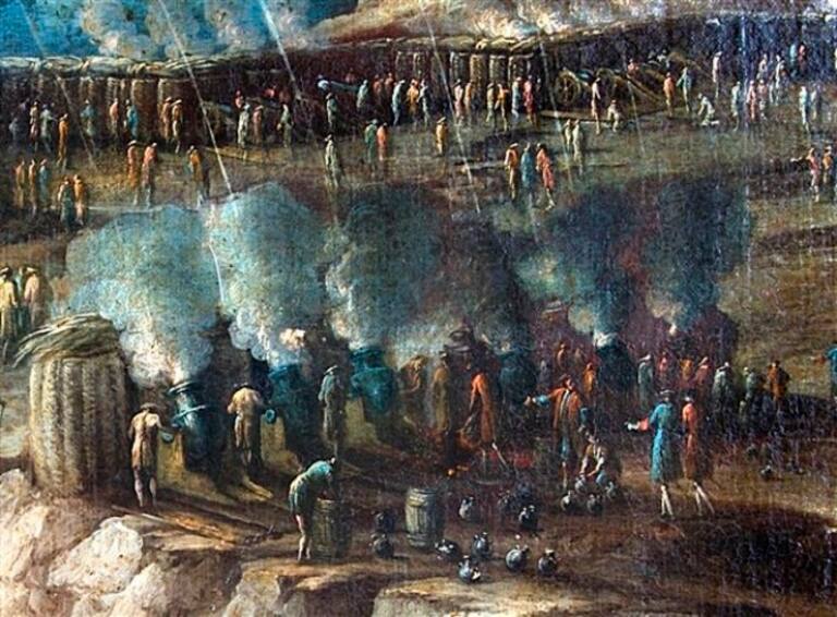• Toma de Mahón (1782): Batería de morteros disparando en plaza