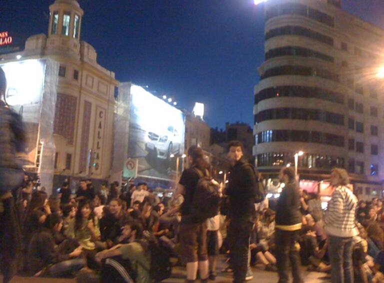 Varios jóvenes sentados intentan cortar las calles del centro de Madrid