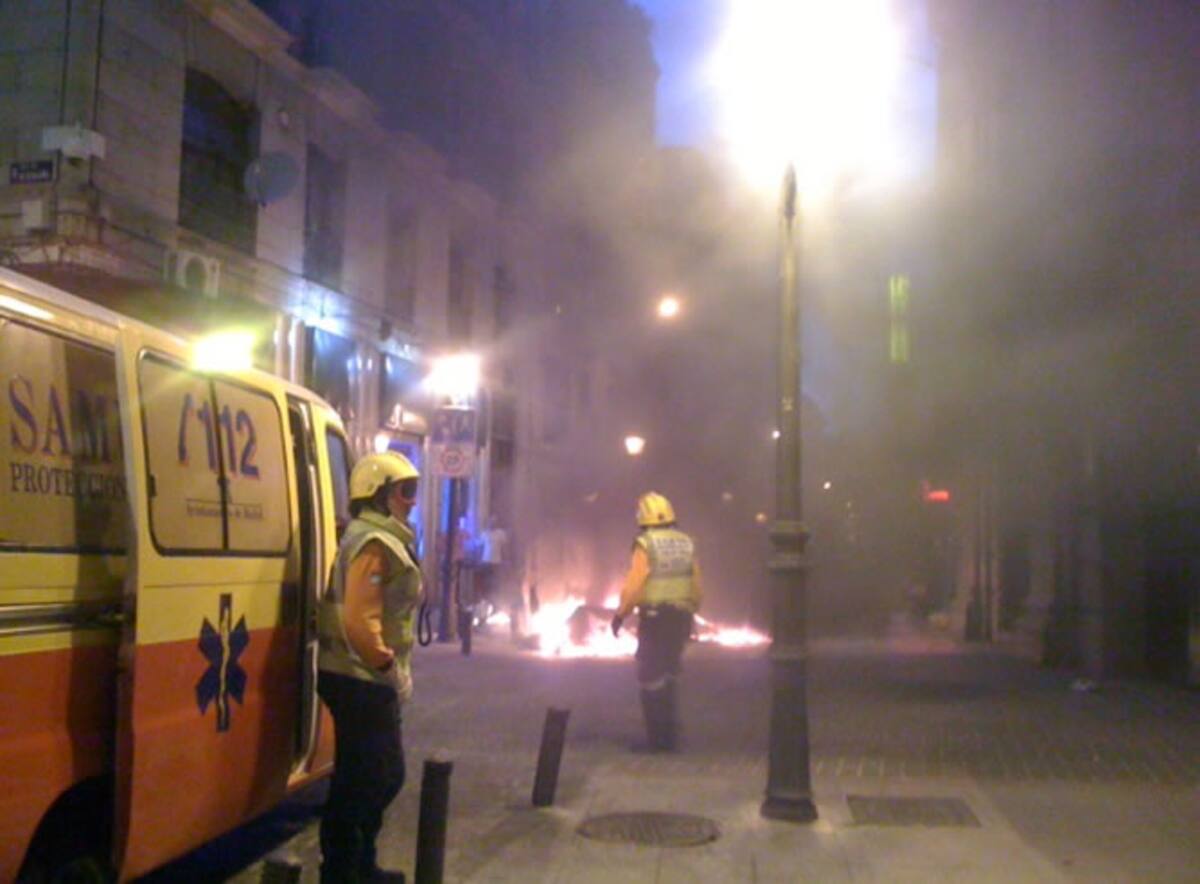 Varios de los manifestantes han quemado contenedores en la calle Valverde y la plaza del Sol, lo que ha creado una gran nube de humo