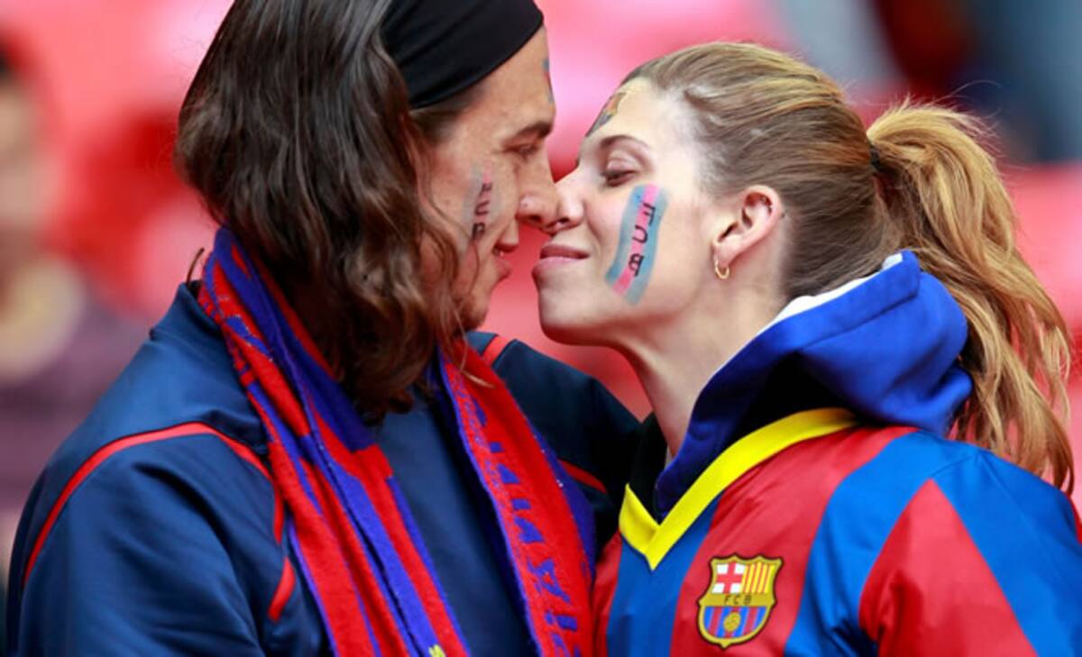 Una pareja de aficionados culé esperan el comienzo de la final entre el Barça y el United