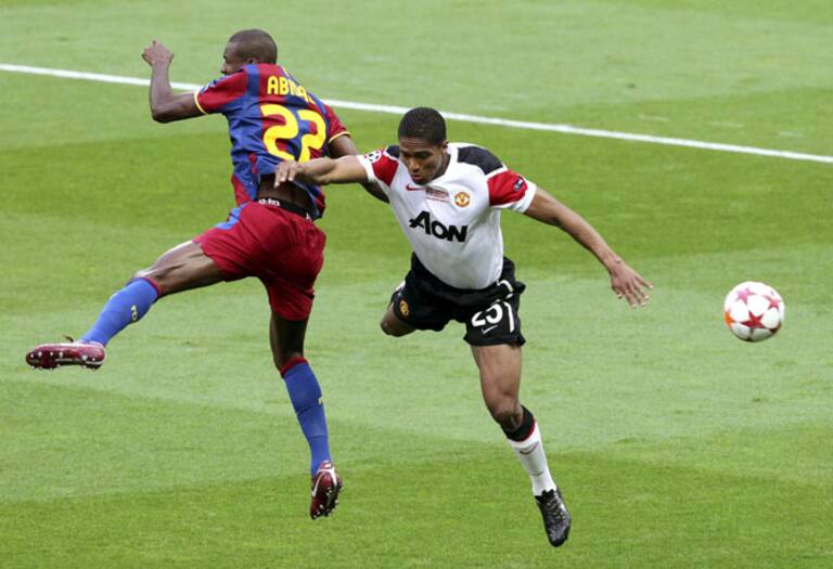 El jugador ecuatoriano del Manchester United Antonio Valencia lucha por el balón con el defensa francés del FC Barcelona Eric Abidal