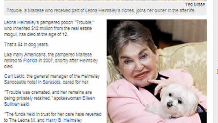 Poco después de su muerte, se supo que la multimillonaria había desheredado a dos de sus cuatro nietos, mientras que mantuvo que Trouble ("problema", en inglés) heredara doce millones de dólares, decisión que, además de ocupar las portadas neoyorquinas durante días, motivó que la perrita recibiera multitud de amenazas de muerte.