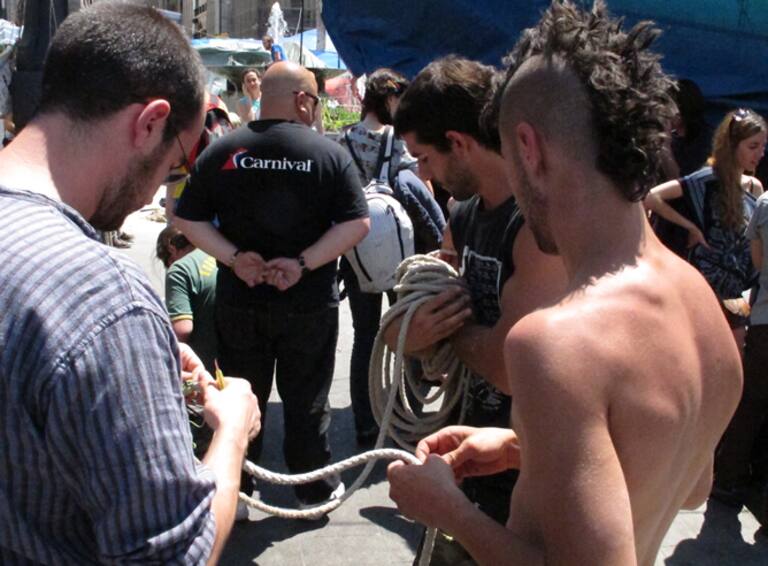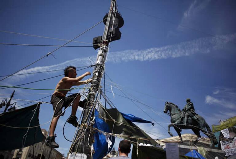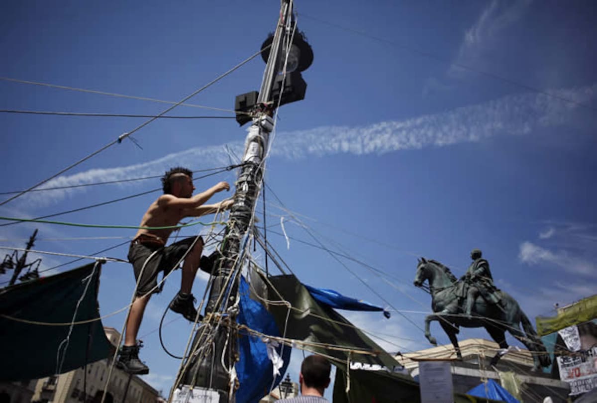 Los 'indignados' desmontan el cableado que ha permitido colgar las lonas de la acampada en la Puerta del Sol