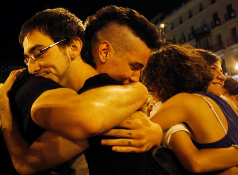 Los manifestantes de la Puerta del Sol se abrazan en el último día de la acampada