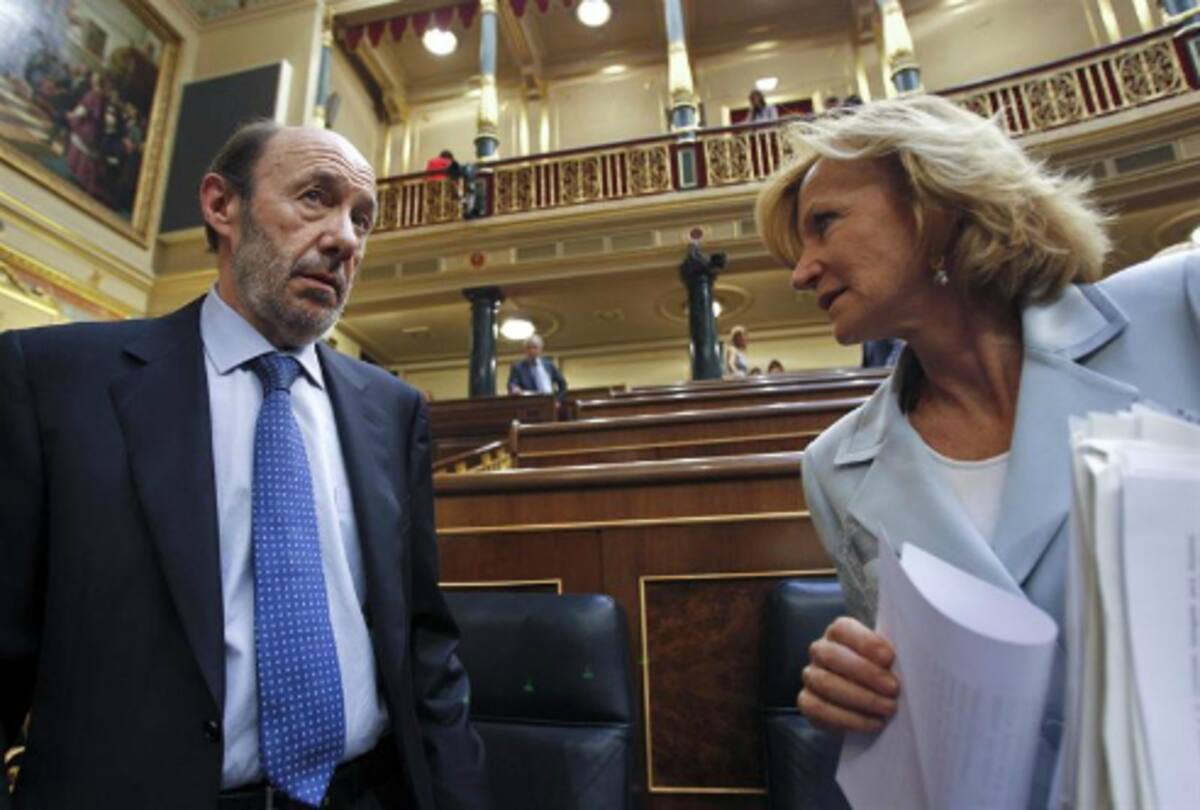El ministro del Interior y vicepresidente primero del Gobierno, Alfredo Pérez Rubalcaba, conversa con la ministra de Economía, Elena Salgado, durante la primera jornada del debate que se celebra hoy en el Congreso de los Diputados