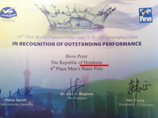 Error en el diploma del húngaro Peter Biros con nacionalidad de Honduras(http://www.vlv.hu/news/6589/fina-baki-magyarorszag-nem-honduras)