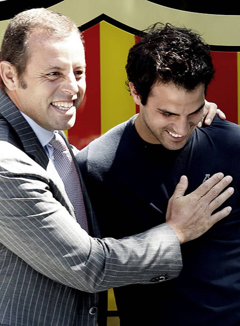 Cesc sonríe junto al presidente del Barça, Sandro Rosell