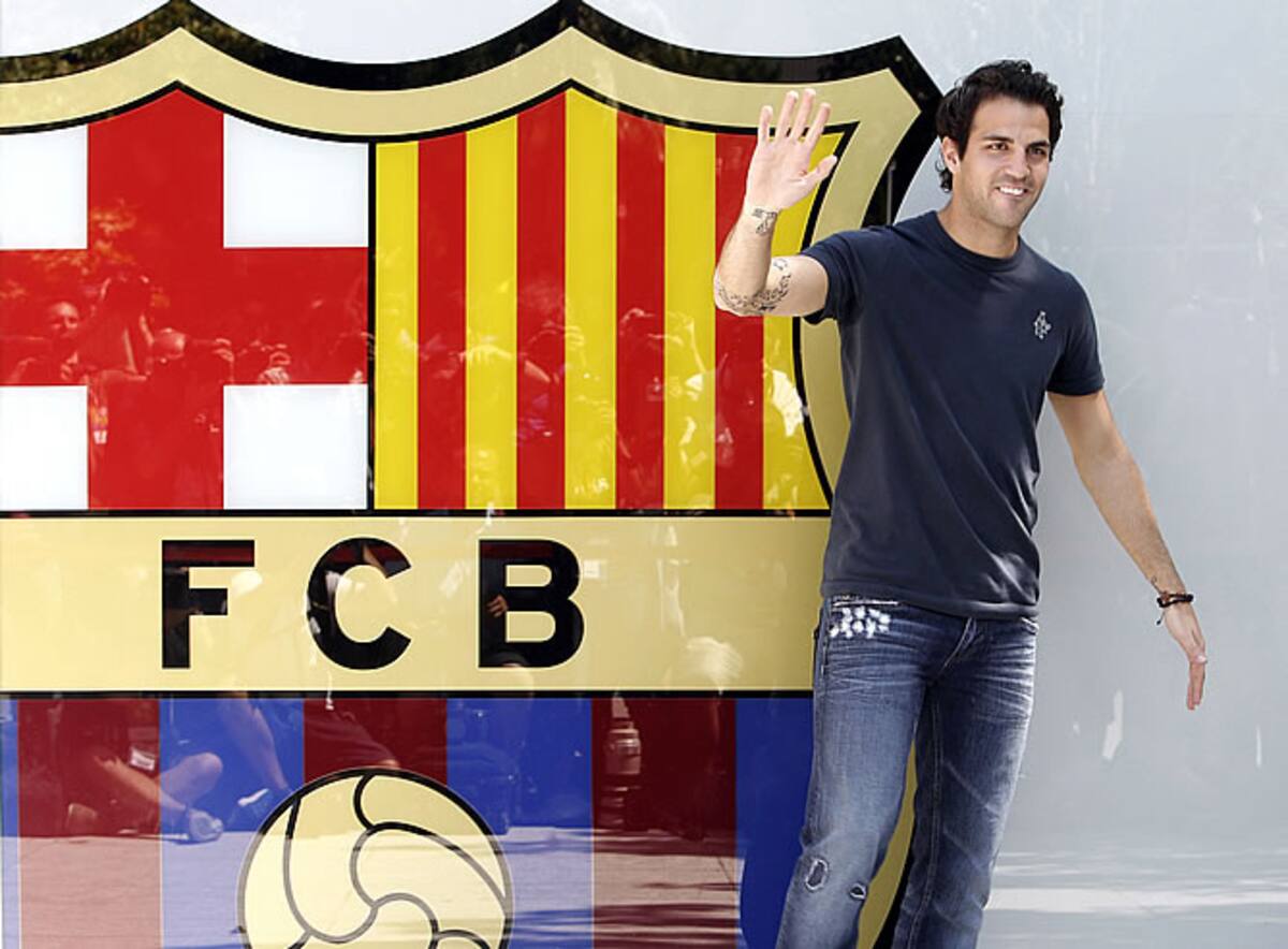 Cesc sonríe delante del escudo azulgrana