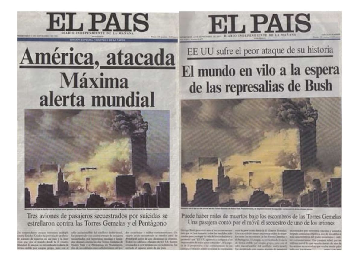 El diario 'El País' publicó dos ediciones el 12 de septiembre de 2001. En la primera, anunciaba la "máxima alerta mundial" tras el ataque y, en la segunda, expresaba la posibilidad de "represalias" por parte del EEUU.