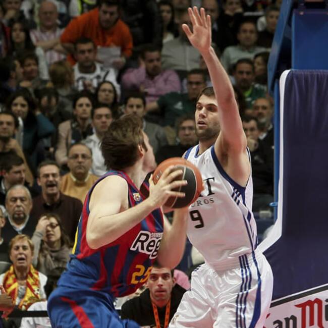 El pívot del Real Madrid Felipe Reyes bloquea el lanzamiento del ala-pívot esloveno del Regal FC Barcelona Erazem Lorbek