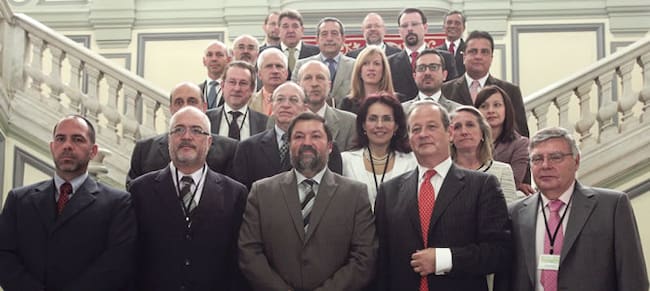 El ministro español de Justicia, Francisco Caamaño, posa para la foto de familia de los asistentes a las Jornadas: "Lucha contra la Corrupción y Cooperación Jurídica Internacional", organizadas en Madrid por la Conferencia de Ministros de Justicia de los (EFE / BALLESTEROS)