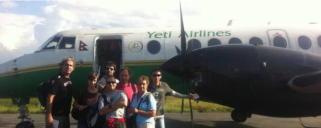 David Alonso con parte del equipo de la expedición en el avión Yeti Airlines(DAVID ALONSO)