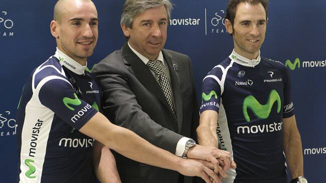 Los corredores Juanjo Cobo y Alejandro Valverde, junto al director del Movistar, Eusebio Unzúe, durante la presentación de ambos como nuevos integrantes del equipo ciclista(EFE)