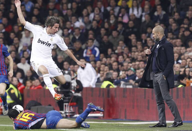 El defensa portugués del Real Madrid, Coentrao, salta por encima del centrocampista del F. C. Barcelona, Sergi Busquets, ante el entrenador blaugrana, Pep Guardiola, durante el encuentro correspondiente a la ida de los cuartos de final de la Copa del Rey,
