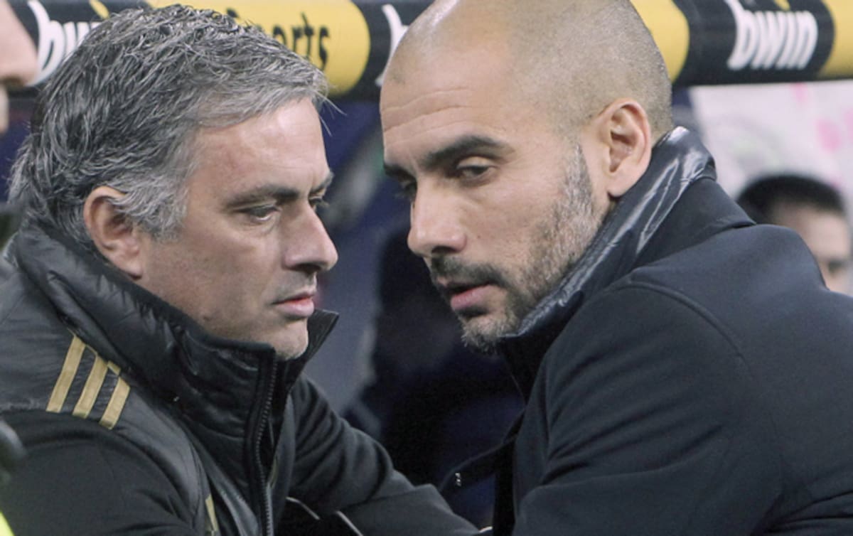 Los entrenadores del Real Madrid, el portugués José Mourinho y del F. C. Barcelona, Pep Guardiola, se saludan en los momentos previos al inicio del encuentro correspondiente a la ida de los cuartos de final de la Copa del Rey, que ambos equipos disputan e