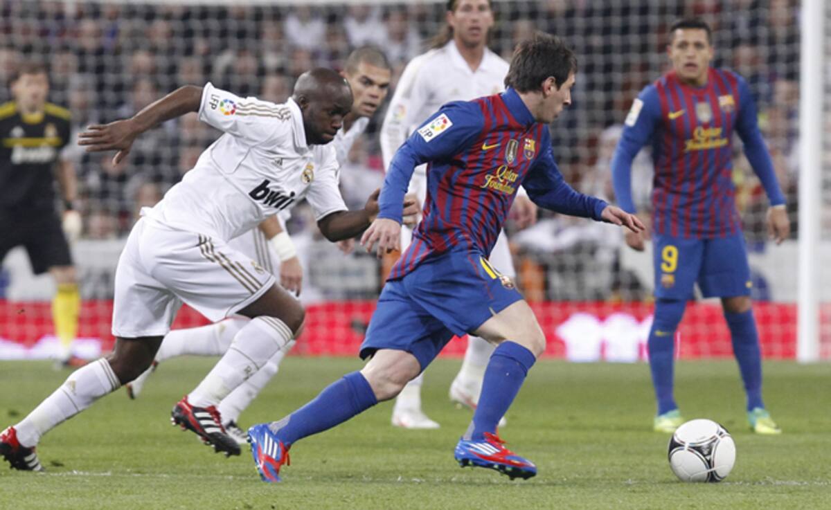 El delantero argentino del F. C. Barcelona, Leo Messi, conduce el balón ante el centrocampista francés del Real Madrid, Lass Diarra, durante el encuentro correspondiente a la ida de los cuartos de final de la Copa del Rey, que ambos equipos disputan esta