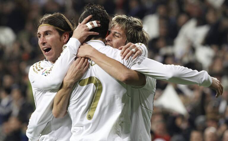 Los jugadores portugueses del Real Madrid, Cristiano Ronaldo, Coentrao y Sergio Ramos, celebran el primer gol del equipo blanco, durante el encuentro correspondiente a la ida de los cuartos de final de la Copa del Rey, que les enfrenta esta noche al F. C.