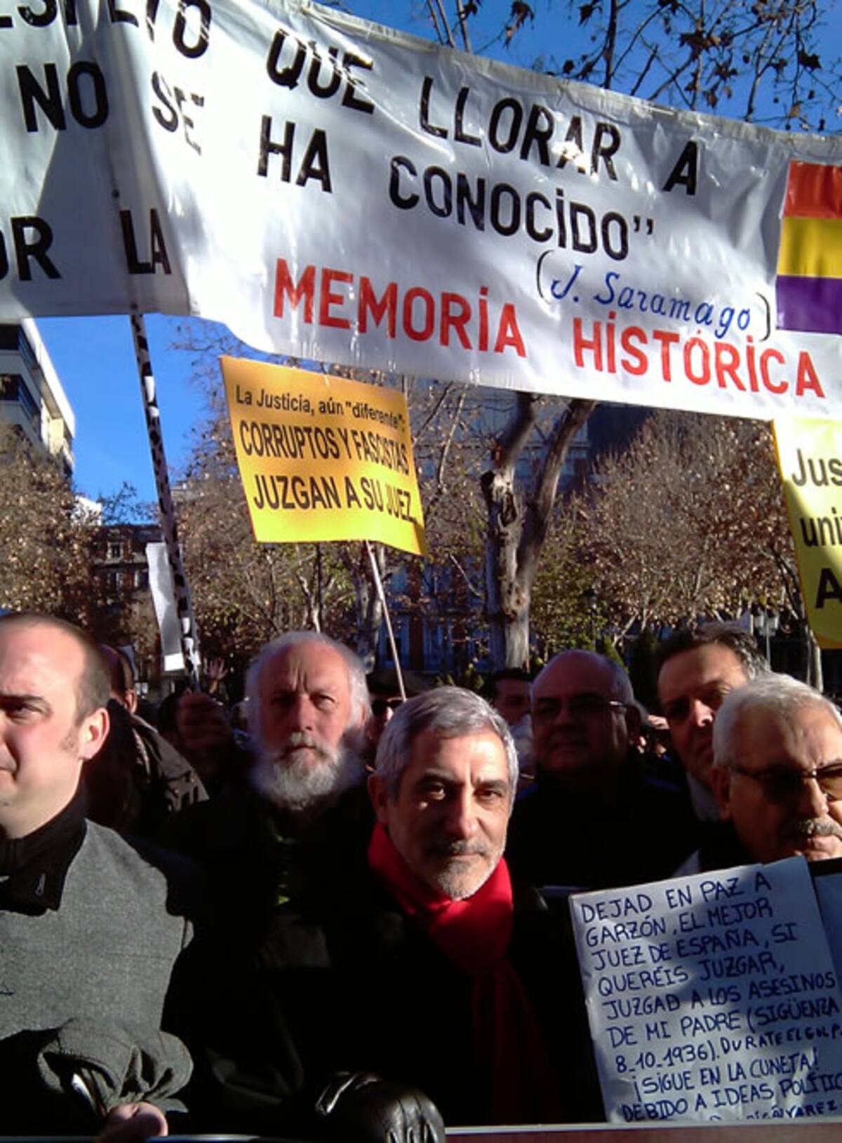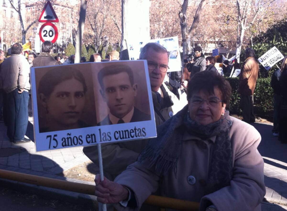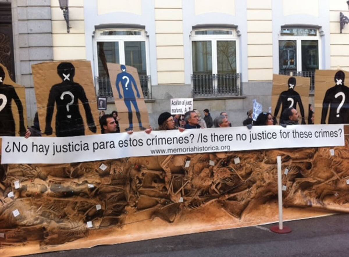 "¿No hay justicia para estos crímenes?" pregunta la pancarta ante el tribunal donde se juzga a Garzón por investigar los crímenes del franquismo