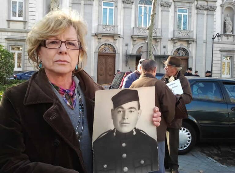 María del Carmen García y la fotografía de su abuelo a la entrada del Supremo antes del juicio contra Garzón