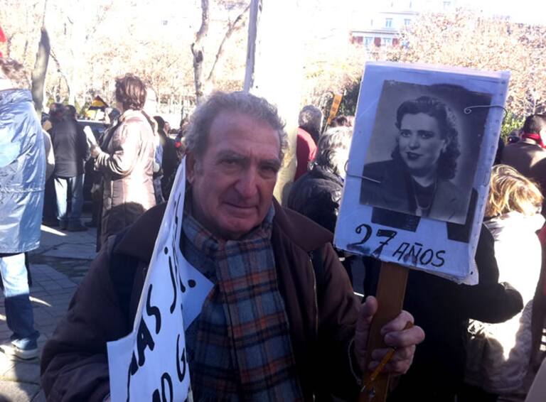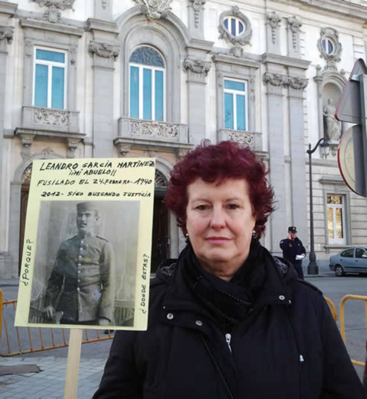 María del Carmen García porta la fotografía de su abuelo fusilado en 1940. Se ha concentrado ante el Supremo en solidaridad con el Juez Garzón y para reclamar justicia con las víctimas del franquismo