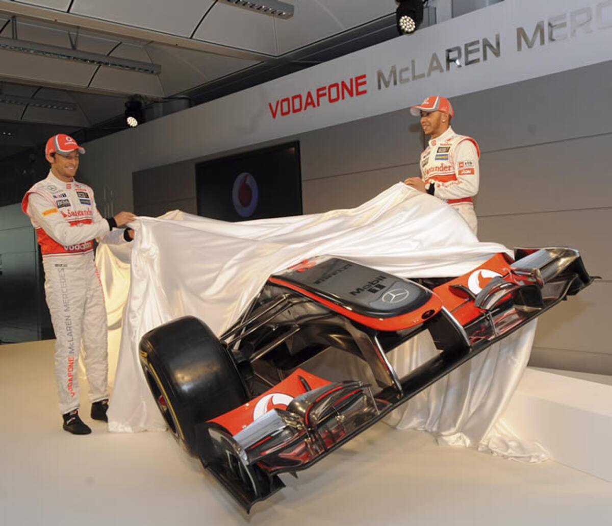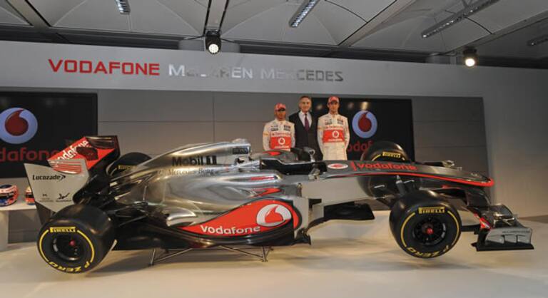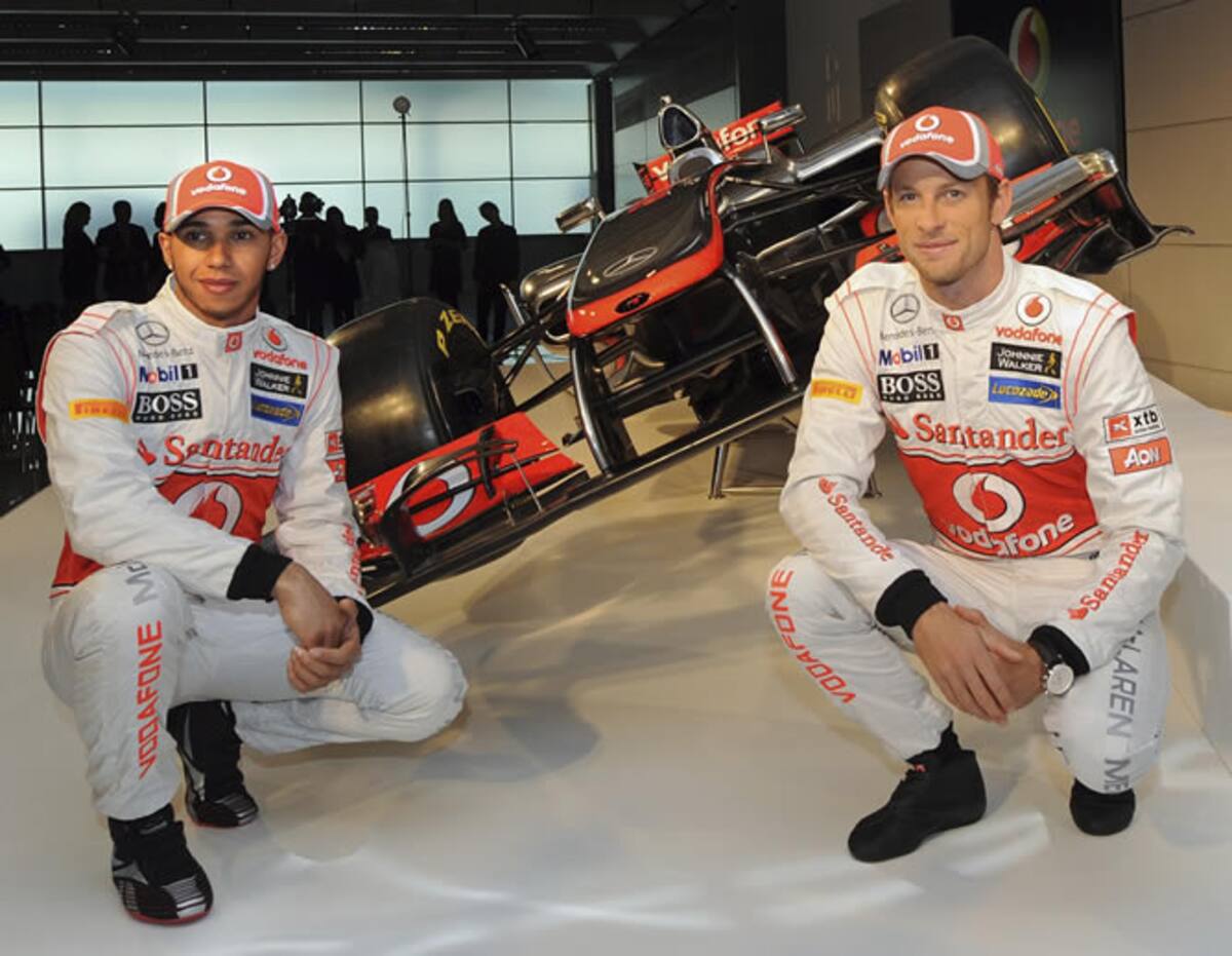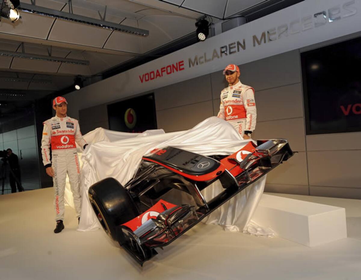 Los pilotos británicos de Fórmula Uno Lewis Hamilton (izq) y Jenson Button (dcha) posan junto al nuevo monoplaza MP4-27