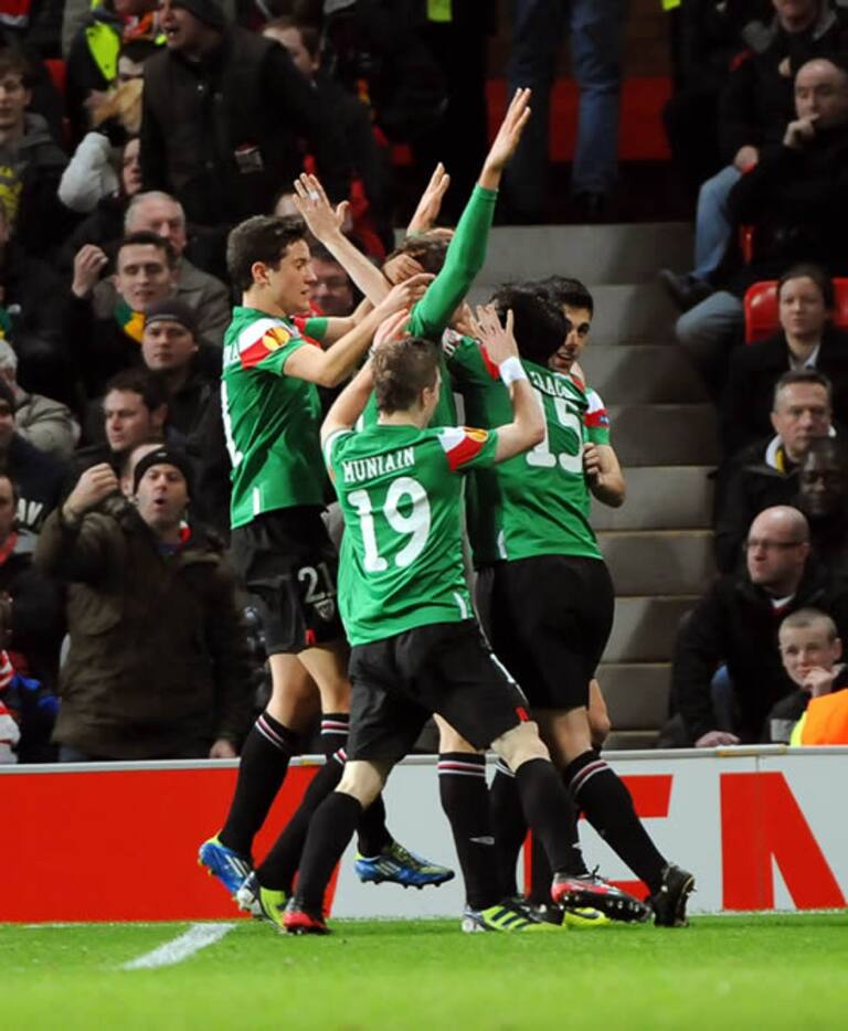 Los jugadores del Athletic de Bilbao celebran después de anotar ante Manchester United