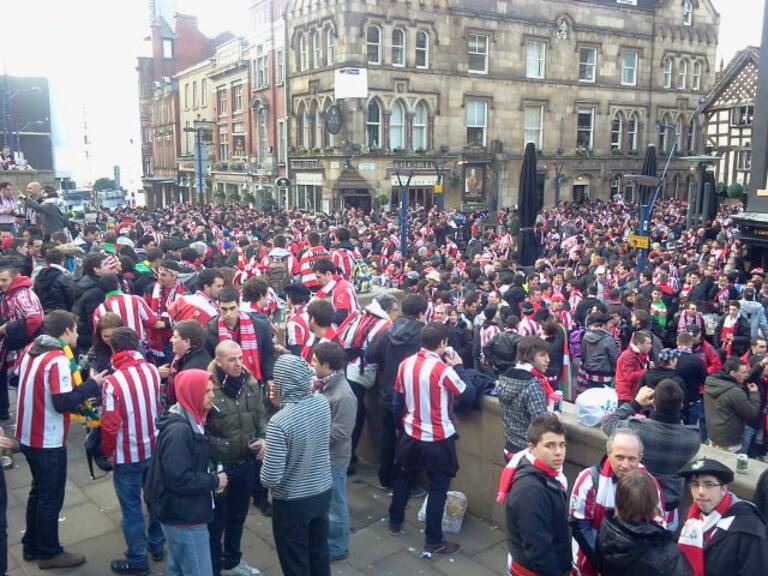 El centro de Manchester, completamente abarrotado de seguidores de leones bilbaínos